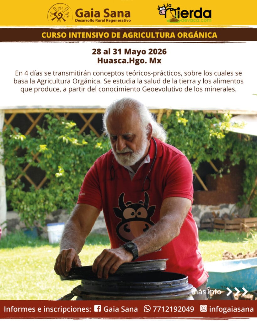 En 4 días se transmitirán conceptos teóricos-prácticos, sobre los cuales se basa la Agricultura Orgánica. Se estudia la salud de la tierra y los alimentos que produce, a partir del conocimiento Geoevolutivo de los minerales. Fecha: 28 a 31 de Mayo Lugar: Huasca, Hidalgo, México. Contacto: +52 7712192049